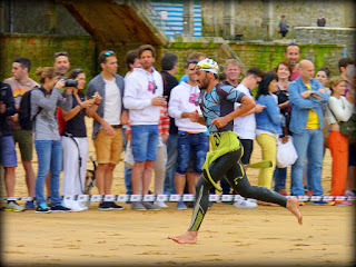 La organización de la prueba atlética en Zarauz merece un 10, y también la participación del público, que se vuelca con ella. La espera de las primeras nadadoras (salen media hora antes que los chicos, creo) que llegan desde Guetaria se lleva muy bien en un entorno tan agradecido como la playa de Zarauz. Y pronto empiezan los gritos de ánimo al salir las primeras en busca del aparcamiento de bicis en el malecón.