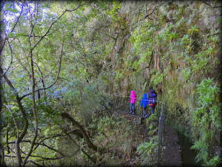 El primer tramo, en descenso por pistas, no es especialmente bonito, pero la cosa cambia al emparejarse nuestra ruta con la levada creada en la primera mitad del s. XIX para llevar las aguas de varios afluentes de la Ribeira Grande hacia una zona más fértil y llana al sur, facilitando su explotación agrícola. Rodeados de la laurisilva madeirense, declarada Patrimonio Mundial por la UNESCO, tras descender casi 300 m. de desnivel que comparten ambas levadas, primero recorremos la del Risco que, a una altura cercana a los 1000 m. de altitud y muy llevadera para todo tipo de caminantes, culmina en un mirador sobre una preciosa cascada.
